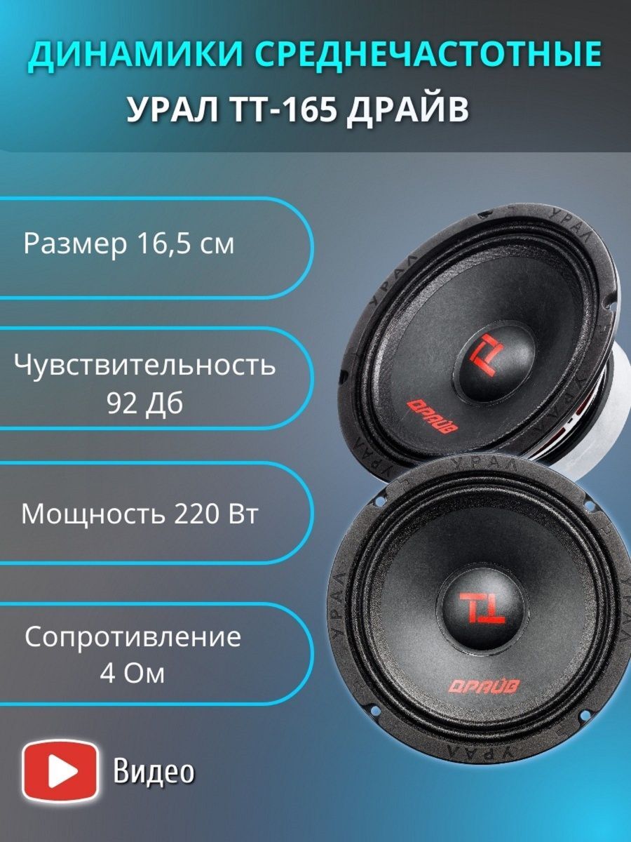Мидрейндж динамики URAL (УРАЛ) TT 165 Драйв(2 штуки) - очень популярные недорогие эстрадные среднечастотные автомобильные колонки (динамики) 16,5 см (6,5 дюймов). URAL ТТ-165 Драйв - Мощная аудиосистема система. Экстремальный уровень громкости (даже от усилителей с небольшой мощностью, в т.ч. от встроенных усилителей автомобильных магнитол). Широкий диапазон звучания колонок для машины. Динамики в машину URAL TT 16 Драйв исполнены в стальных штампованных корзинах, играют чисто и громко, по качеству звука превосходны в своем ценовом сегменте! Максимальная звуковая мощность у динамиков Урал 16-220 Вт, номинальная (RMS) - 110 Вт, Чувствительность 95 дБ, звуковая катушка 1 дюйм. УСТАНОВОЧНЫЕ РАЗМЕРЫ акустической системы dinamik URAL TT-165 Драйв - Общая высота динамиков автомобильных 80 мм Установочная глубина 76 мм Внешний диаметр 167 мм Диаметр монтажного отверстия 145 мм Диаметр магнита 100 мм. Цена за комплект - две круглые колонки. Отличный подарок ко Дню влюбленных (День Святого Валентина), Дню Защитника Отечества. Отличные динамики для вашего авто и качественное музыкальное улучшение автозвука в автомобиле. Эстрадная, или концертная акустика — отдельный тип профессиональных акустических систем, использующихся преимущественно в автозвуке. К эстрадным колонкам относятся высокочастотные, среднечастотные и низкочастотные динамические головки.
