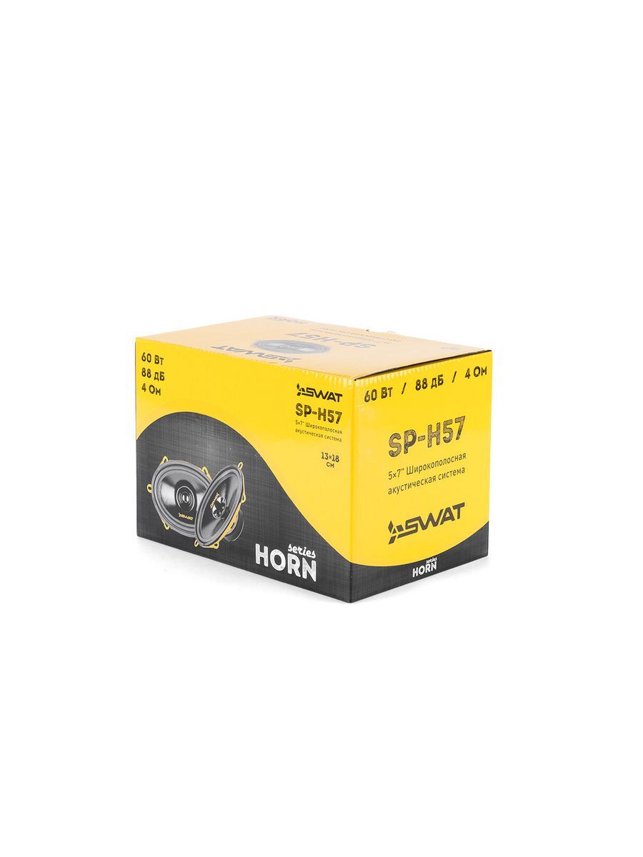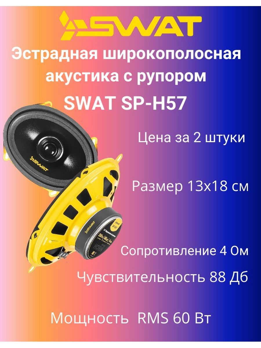 Акустика Swat SP-H57 (Цена за 2 штуки) -эстрадная широкополосная акустика спроектирована для работы как от встроенных усилителей ГУ, так и для совместной работы с внешними усилителями мощности. Прекрасная альтернатива штатным динамикам! Все системы имеют неглубокую посадку, высокую чувствительность и широкий диапазон воспроизводимых частот. Легкий и прочный диффузор из целлюлозы, в купе с оптимальной магнитной системой, позволяют получить приличный уровень звукового давления, даже от головного устройства. Применение в конструкции центрального колпачка с рупором и короткозамкнутый виток (кольцо Фарадея) в магнитной системе, существенно расширили полосу частот в верхнем регистре (до 16 кГц!), при малых искажениях. Динамики обладают сбалансированным звучанием даже на приличной громкости. Все акустические системы линейки, за исключением калибров 4х6 и 5х7, комплектуются защитными сетками-грилями. Яркий фирменный дизайн и драйвовое звучание, не оставит равнодушным любителей автозвука! [Описание] Тип акустической системы: Эстрадная широкополосная с рупором. Размер: 5х7" (13х18 см). Количество полос: 1. Мощность RMS: 60 Вт. Мощность PMPO: 250 Вт. Звуковая катушка: 1"(2,54 см). Сопротивление: 4 Ом. Частотный диапазон: 80 Гц - 16 кГц. Чувствительность (1Вт/1м): 88 дБ. Материал диффузора: Целлюлоза с пропиткой. Материал подвеса: Вспененный полиуретан. Материал корзины: Сталь. Магнитная система: Феррит. Монтажный диаметр: 182х128 мм. Монтажная глубина: 65 мм. Защитная сетка: В комплекте.