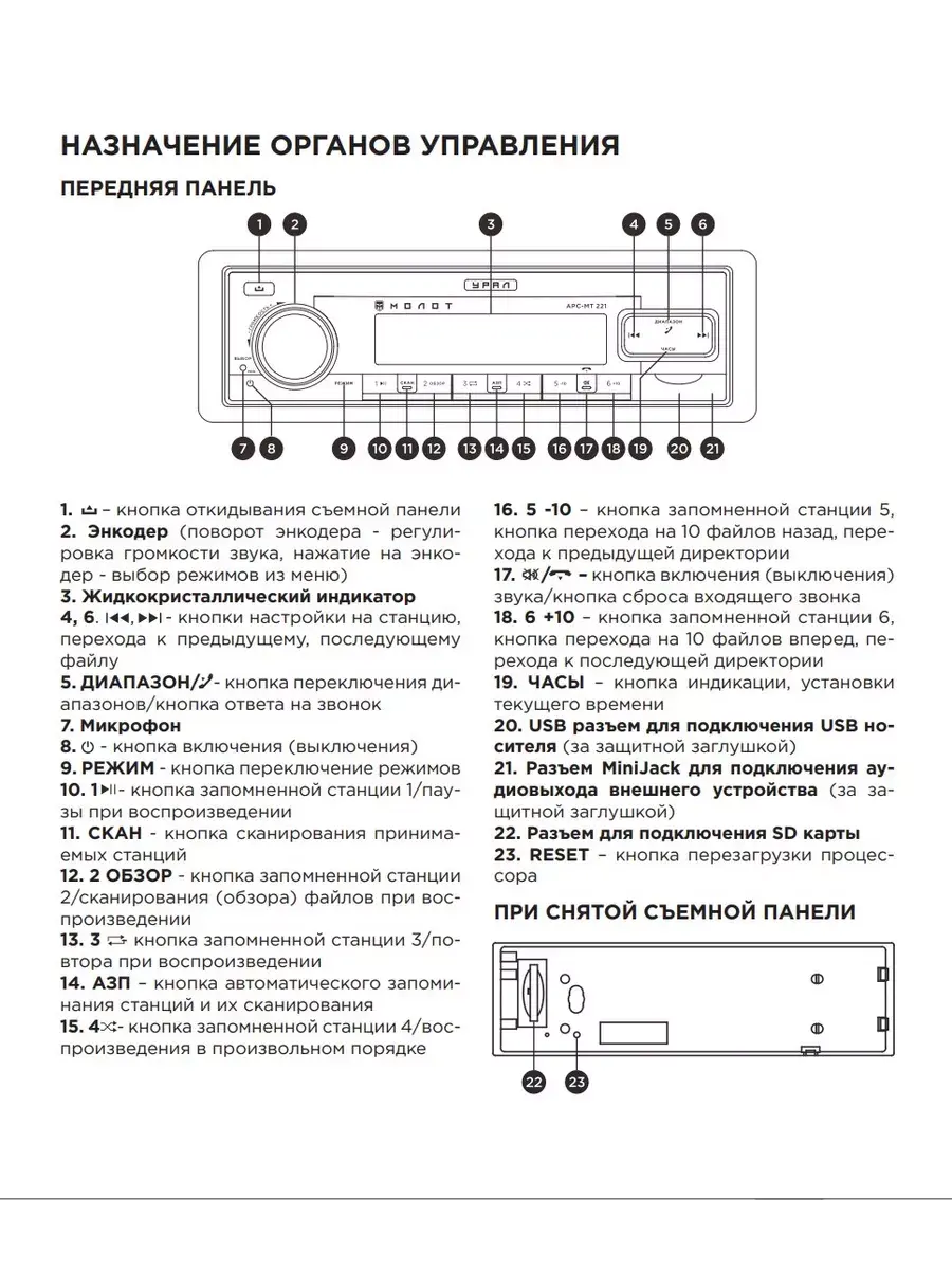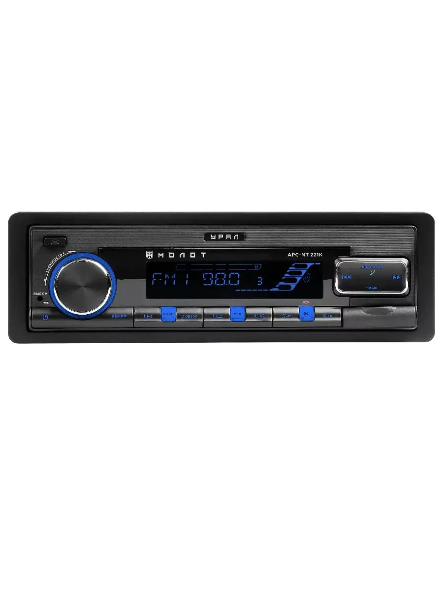 Автомобильная магнитола 1 Din Урал Молот АРС-МТ 221К с блютуз и синей подсветкой — это автопроигрыватель с выходной мощностью 100 Вт (4x25 Вт), который обеспечит мощный и чистый звук в вашем автомобиле. Передняя панель съемная, под ней расположен слот для карточек SD. Управление радиоприемником с помощью приложения SmartBT iPlug. Ресивер оснащен эквалайзером и общим количеством каналов звука в 4, что позволяет настраивать звучание под свой вкус. Автомагнитола имеет максимальный частотный диапазон 20000 Гц и минимальный 20 Гц, что делает ее идеальным выбором для любого музыкального жанра. С помощь Bluetooth nы сможеim прослушивать музыку с смартфона или планшета без проводов, а также принимать телефонные звонки в режиме hands-free. Она поддерживает формат MP3 и имеет разъемы для AUX и USB. С помощью 10-полосного эквалайзера можно настраивать воспроизведение в зависимости от твоих предпочтений. Головное устройство также имеет LCD-дисплей, который отображает информацию о воспроизводимой музыке, а красная подсветка кнопок и дисплея добавляет элегантности в любой автомобиль. Совместима с android.