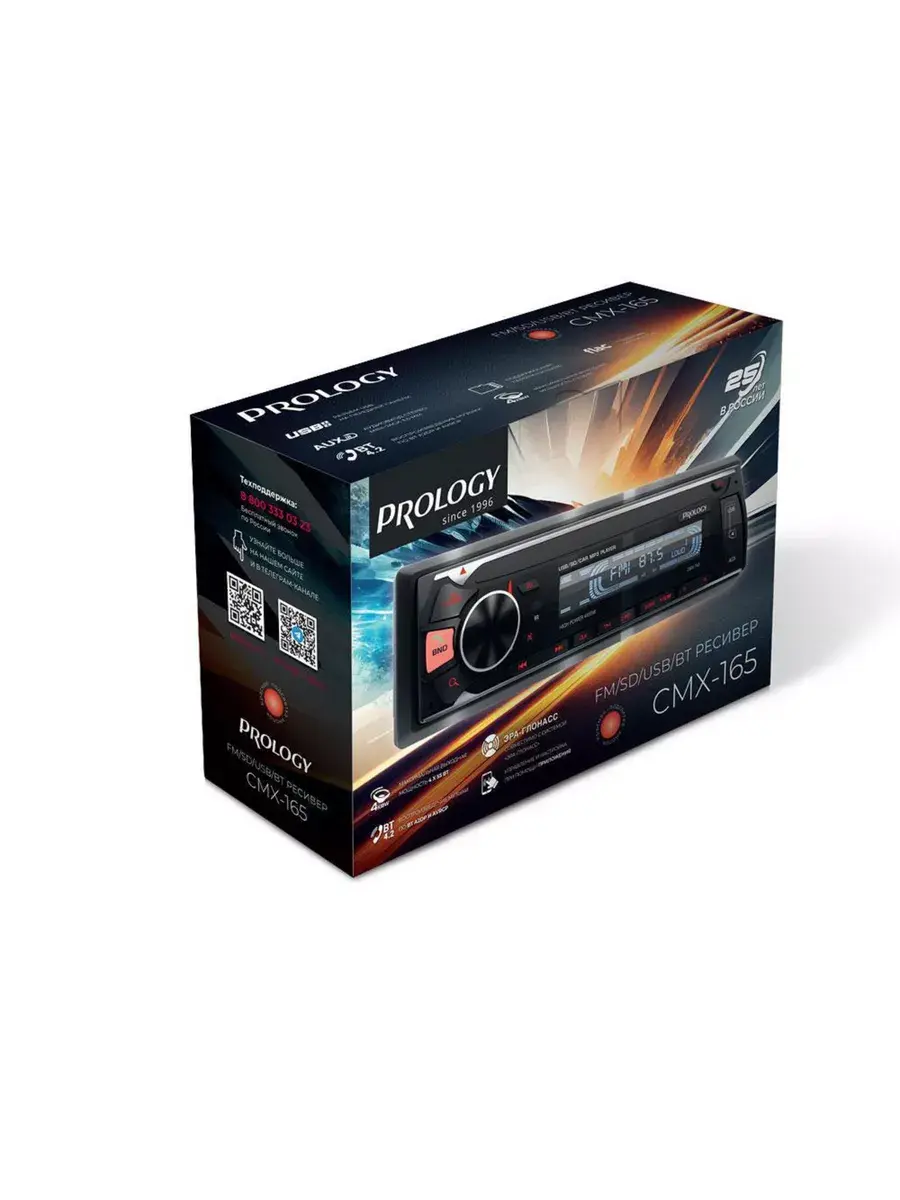 Prology CMX-165 — FM SD/USB ресивер с Bluetooth, это автомагнитола стандартного размера 1DIN, которая обеспечивает прием радиостанций в диапазоне FM, воспроизведение медиафайлов, записанных на карты памяти USB / microSD, передачу звука с внешних источников, а также управление мобильным телефоном через интерфейс Bluetooth (ver. 4,2). Кроме того, устройством можно управлять с помощью приложения, установленного на Ваш смартфон с операционной системой Android. [Особенности] Максимальная выходная мощность 4 х 55 Вт, поддержка акустики на 4 и 8 Ом; Встроенный электронный эквалайзер на 4 предустановки и режим дополнительной тонкомпенсации LOUD, отдельные регулировки Высоких и Низких частот, настройки Баланса и Фейдера фронт/тыл; Высокоскоростной цифровой PLL тюнер FM диапазона с памятью на 18 станций и режимом автоматического поиска радиостанций; Воспроизведение файлов в форматах: MP3, WMA, WAV, а также формата FLAC, который обеспечивает качество звучания аналогичное оригинальному CD-диску (Аудио-файлы FLAC-Free Lossless Audio Codec File — файлы аудио-формата, в котором используется сжатие без потери качества звучания). Параметры поддерживаемых файлов - MP3 (320 кбит/с / 44.1 кГц / 16 бит), WMA (320 кбит/с / 44.1 кГц / 16 бит), WAV (1411 кбит/с / 16 кГц / 16 бит), FLAC (44.1 кГц / 16 бит); Фронтальные разъёмы для подключения USB накопителей и карт памяти формата microSD, поддержка носителей с объёмом до 256 ГБ Поддержка Bluetooth профилей: A2DP и AVRCP — Воспроизведение музыки, управление воспроизведением; HSP, HFP — hands-free и управление звонками телефона. Установленная версия Bluetooth version 4.2; Широкие возможности для дополнительных подключений и построения сложной звуковой системы в автомобиле: 4 канальный линейный RCA аудиовыход для подключения внешних усилителей, Линейный аудиовход AUX 3,5 мм mini-jack на передней панели; Красная подсветка клавиш управления на передней панели автомагнитолы; В комплекте инфракрасный пульт ДУ карточного типа; Укороченный металлический корпус; Минимальная установочная глубина - 90 mm