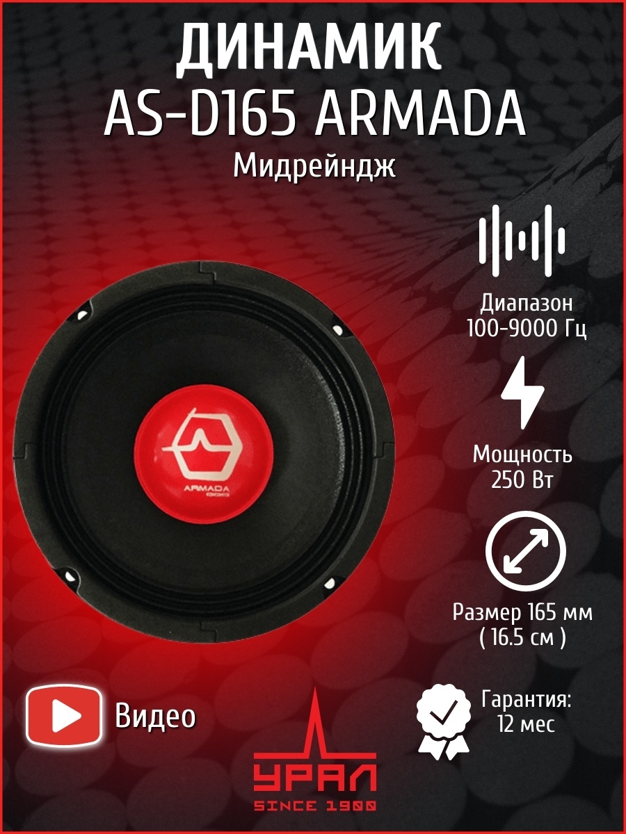 Среднечастотная Акустическая Система для авто Ural AS-D165 ARMADA воспроизводит звук в диапазоне от 100 до 9000 Гц. Номинальная мощность круглого динамика составляет 125 Вт, а максимальная мощность в два раза выше - 250 Вт. Чувствительность акустики равна 93 дБ. При монтаже автодинамика и эксплуатации следует учитывать отсутствие защитной сетки в комплекте. УРАЛ AS-D165 ARMADA аккустическая аудиосистема является отличным выбором для автолюбителей и музыкальных энтузиастов, СЧ динамик может быть отличным подарком для мужчины или парня. Мы гарантируем, что при покупке в нашем магазине вы получите только новый и оригинальный товар с гарантией от произв