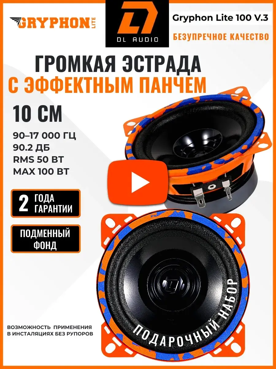 Хочешь заменить штатку в своем автомобиле ? Тогда лучшая бюджетная авто акустика для тебя! Обновленная версия автомобильных, эстрадных громких динамиков Dl Audio Gryphon Lite 100 v.3 с ярким и сочным звучанием для своего бюджета. Набор автоакустики состоит из пары, круглых, среднечастотных колонок в машину в размере 10 см или 100 мм. Автоколонки с номинальной мощностью 50 Вт и чувствительностью 90.2 Дб. Обладают идеальным балансом баса, стиля и приятного звучания в диапазоне от 90-17000Гц. Автодинамики на штампованной стальной корзине с ребрами жесткости и пылезащитным колпаком. Имеют сбалансированную АЧХ благодаря кольцу Фарадея и двухволневой тканевый подвес со специальной пропиткой.Просты в установке, подойдут для фронта в передние и задние двери и полку. Будут отличным подарком для мужчины и женщины и любого любителя автозвука.Имеют возможность применения в инсталляциях без рупоров.
