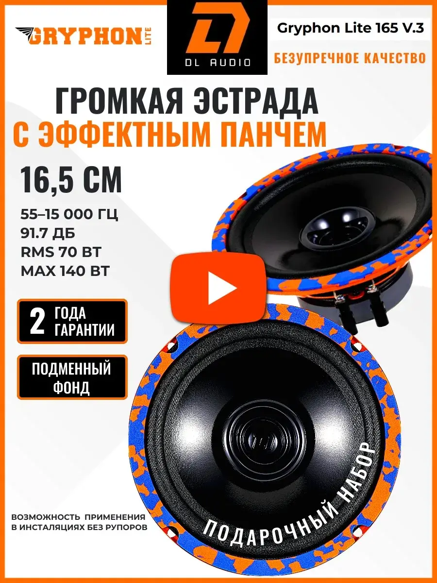 Хочешь заменить штатку в своем автомобиле ? Тогда лучшая бюджетная авто акустика для тебя! Обновленная версия автомобильных, эстрадных громких динамиков Dl Audio Gryphon Lite 165 v.3 с ярким и сочным звучанием для своего бюджета. Набор автоакустики состоит из пары, круглых, среднечастотных колонок в машину в размере 16.5 см или 6,5 дюймов. Автоколонки с номинальной мощностью 70 Вт и чувствительностью 91.7 Дб. Обладают идеальным балансом баса, стиля и приятного звучания в диапазоне от 55-15000Гц. Автодинамики на штампованной стальной корзине с ребрами жесткости и пылезащитным колпаком. Имеют сбалансированную АЧХ благодаря кольцу Фарадея и двухволневой тканевый подвес со специальной пропиткой.Просты в установке, подойдут для фронта в передние и задние двери и полку. Будут отличным подарком для мужчины и женщины и любого любителя автозвука.Имеют возможность применения в инсталляциях без рупоров.