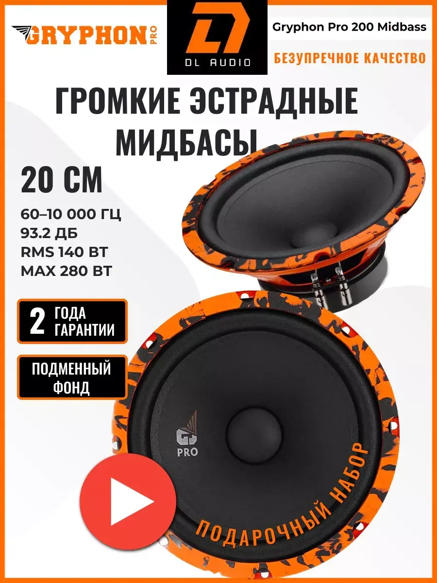 Громкие, мидбасовые, эстрадные колонки 20 см Dl Audio Gryphon Pro 200 Midbass хорошо басят и отлично отыгрывают середину. Акустическая музыкальная аудио система состоит из пары круглых автомобильных динамиков в машину типоразмером 20 см или 8 дюймов. Автоколонки обладают номинальной мощностью 140 и максимальной 280 Вт. Диапазон частот от 60 до 10 000 Гц с чувствительностью 93,2 Дб. Идеально подходят для замены штатной автоакустики в автомобиле. Имеют широкий подвес, усиленную магнитную систему, высоту намотки звуковой катушки. Проработанный вес подвижной системы, плотность подвеса и жесткость шайбы. Все это позволяет получить очень жирные низы автозвука в сочетании с достаточным уровнем громкости, чтобы не теряться на фоне громких среднечастотников. Яркий стильный дизайн не оставит равнодушным истинного ценителя автозвука. Автодинамики будут отличным подарком для мужчины и женщины, парня или девушки, на любой повод от дня рождения до годовщины. Гарантия от производителя 2 года.