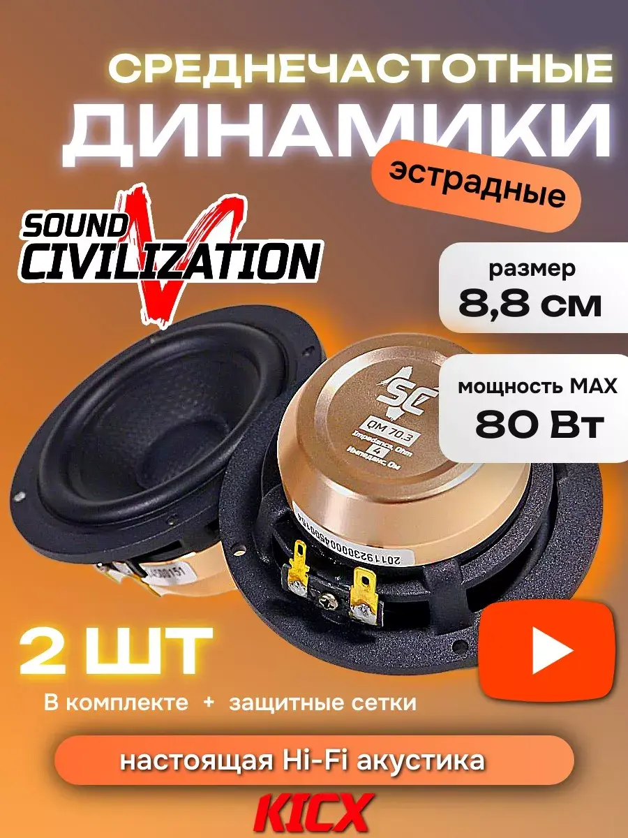 Настоящая Hi-Fi акустика для создания трехполосного фронта. Набор автомобильных колонок в рамзмере 8,8 см разработан специально для очень требовательных ценителей музыки различного жанра. Позволяет добиться кристалически чистого звучания автоакустики. Автомобильные, широкополосные колонки Sound Civilization QM 70.3 - это комплект из двух среднечастотных, маленьких, круглых динамиков в размере 8,8 см с номинальной мощностью 25 и макисмальной 50 Вт. Автоколонки на неодимовом магните, литой алюминиевой корзине с бутилкаучуковым подвесом. Автодинамики имеют диффузор из стеклопластикового компаунда. При использовании в комплекте с системой Sound Civilization QD 6.2 вы получаете полную картину возможностей, данной акустической системы. Будут отличным подарком для ценителей автозвука. Оригинальный товар с гарантией от производителя.