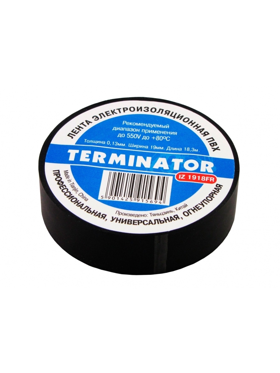 # Изолента на ПВХ-основе. Рекомендуемый диапазон применения: до 550V, +80 С. Толщина полотна 0,13мм делает её достаточно эластичной и прочной. Длина мотка 18,3 метра и ширина 19мм достаточна для выполнения различных задач при ремонте автомобиля и в быту. Лента изоляционная Terminator IZ 1918FR, профессиональная, огнеупорная, универсальная.