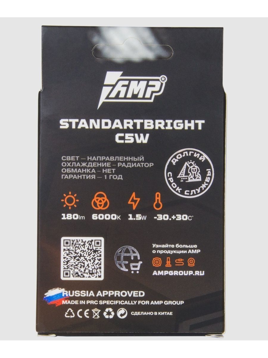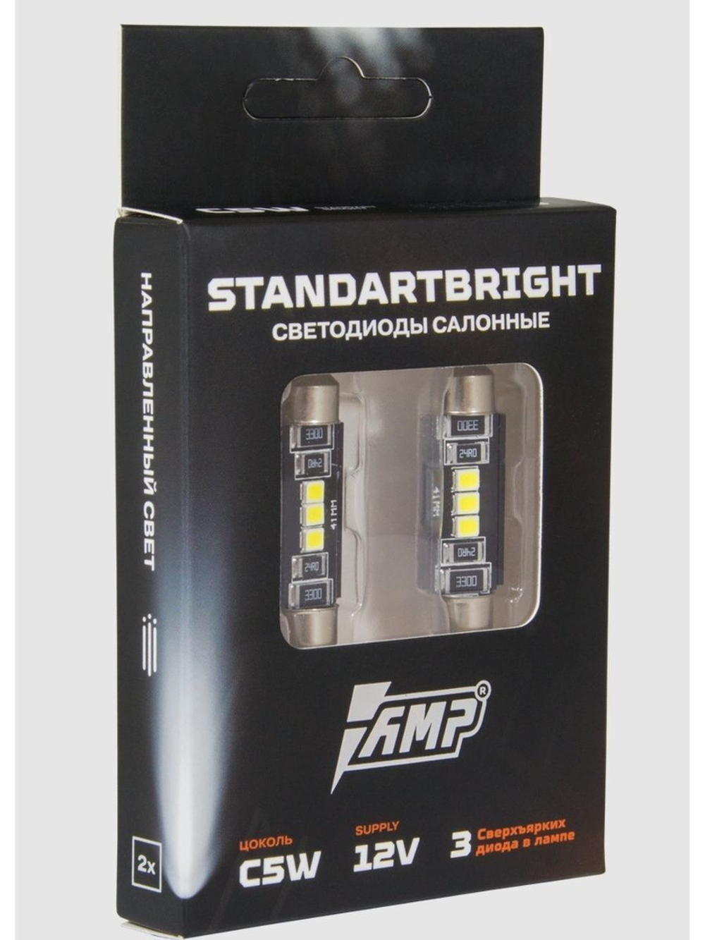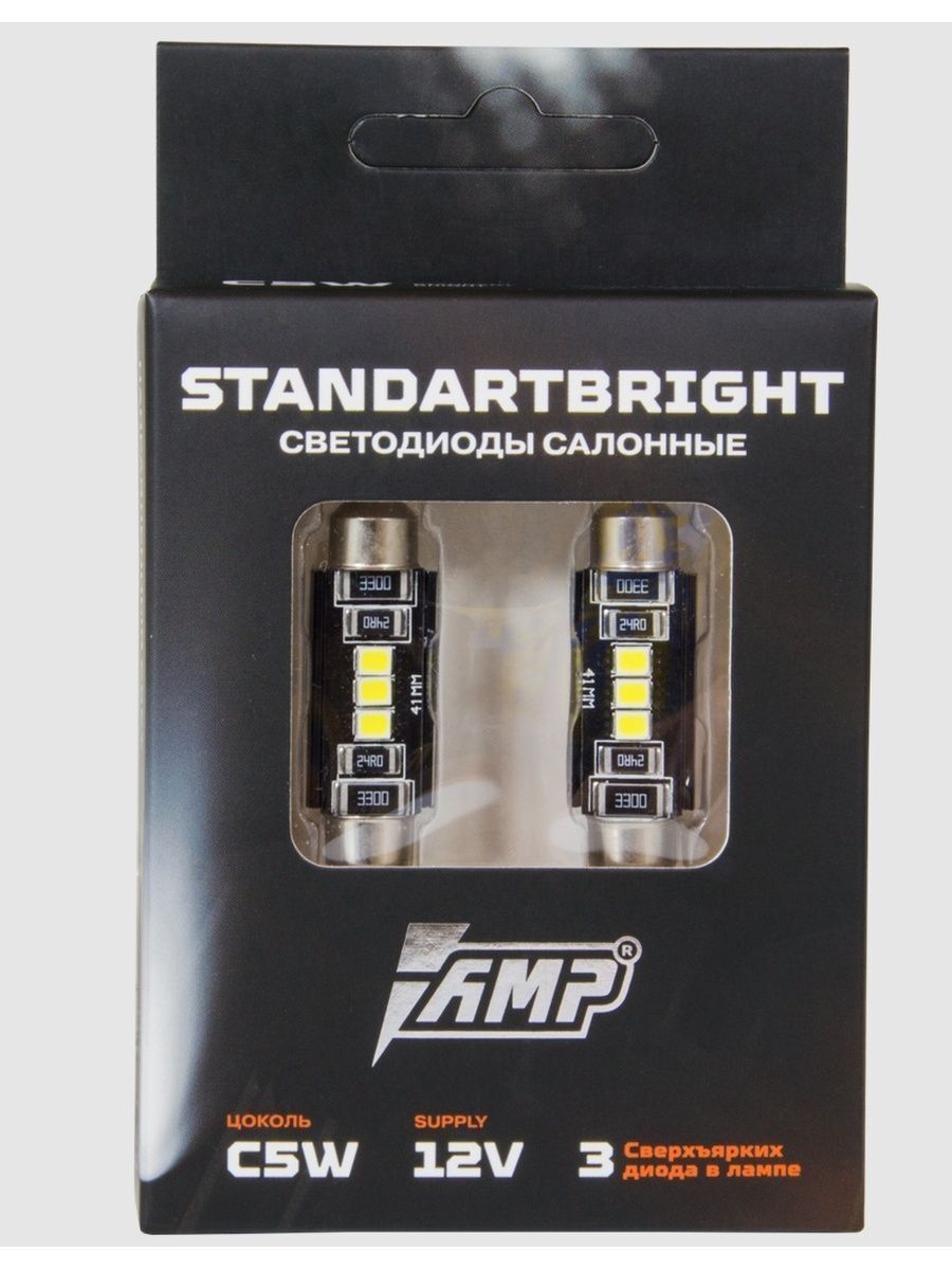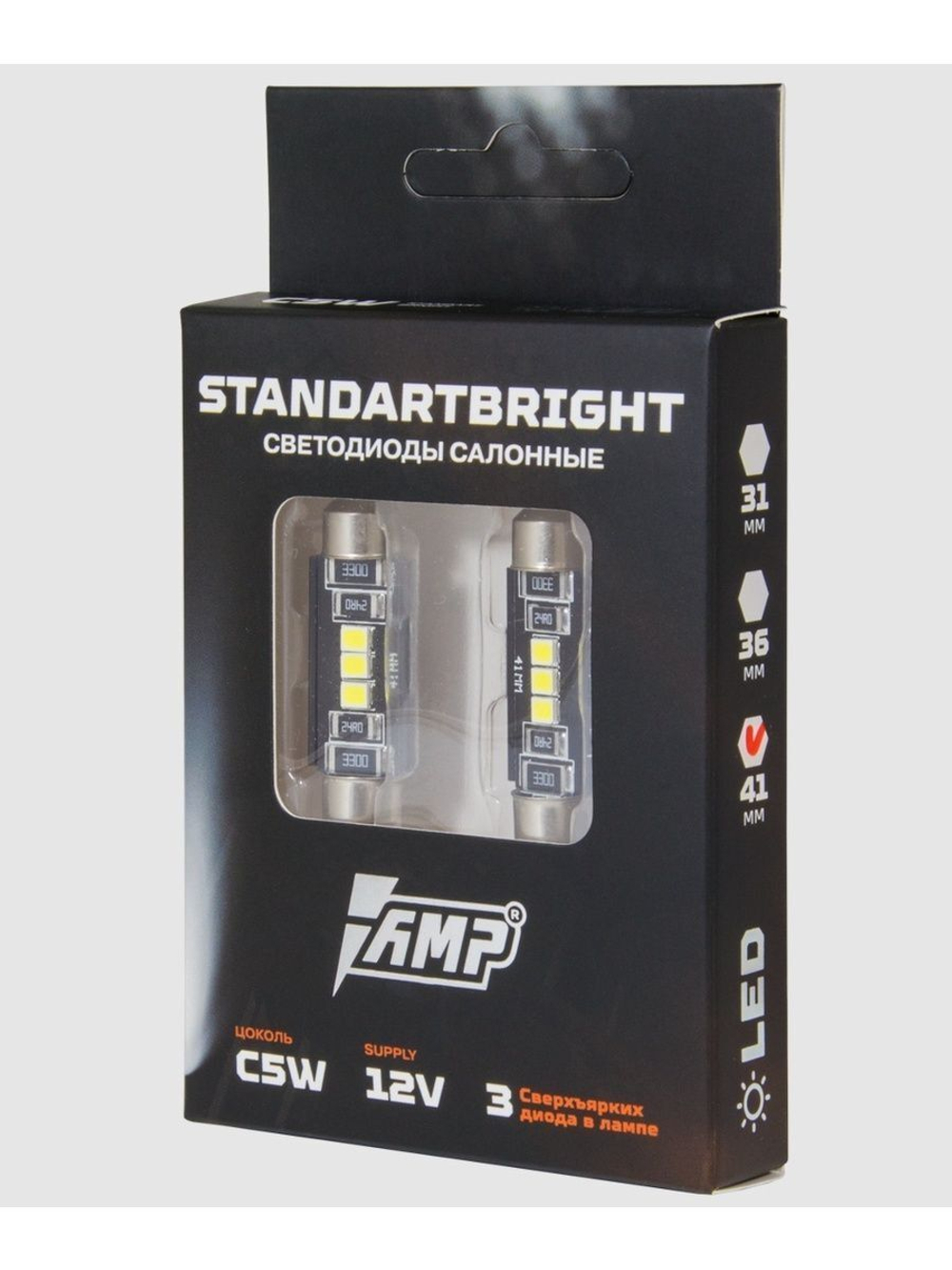 LED лампы в авто AMP Standart Bright C5W-цена указана за комплект- 2 шт. 41 мм. Модель с направленным светом и 3мя современными сверх-яркими диодами. Салонные диоды светят намного ярче простых ламп и потребляют меньше энергии. Благодаря этому ваш аккумулятор не разрядится за ночь работы салонного освещения, как это было бы с обычными лампами. Светодиодные лампочки-это полупроводники, которые, пропуская электрический ток, создают световое излучение. При мощности тока в 1 Вт они способны излучать световой поток 70-100 люмен, а в группе 20-40 штук это значение еще выше. Таким образом, автомобильные LED лампы способны давать свет до 2000 лм и работать от 30 000 до 50 000 часов с небольшим снижением яркости. Отсутствие нити накаливания делает лэд-лампы устойчивыми к механическим повреждениям.етовой поток 180 Люмен. Цветовая температура 6000 Кельвин. Алюминиевый радиатор.