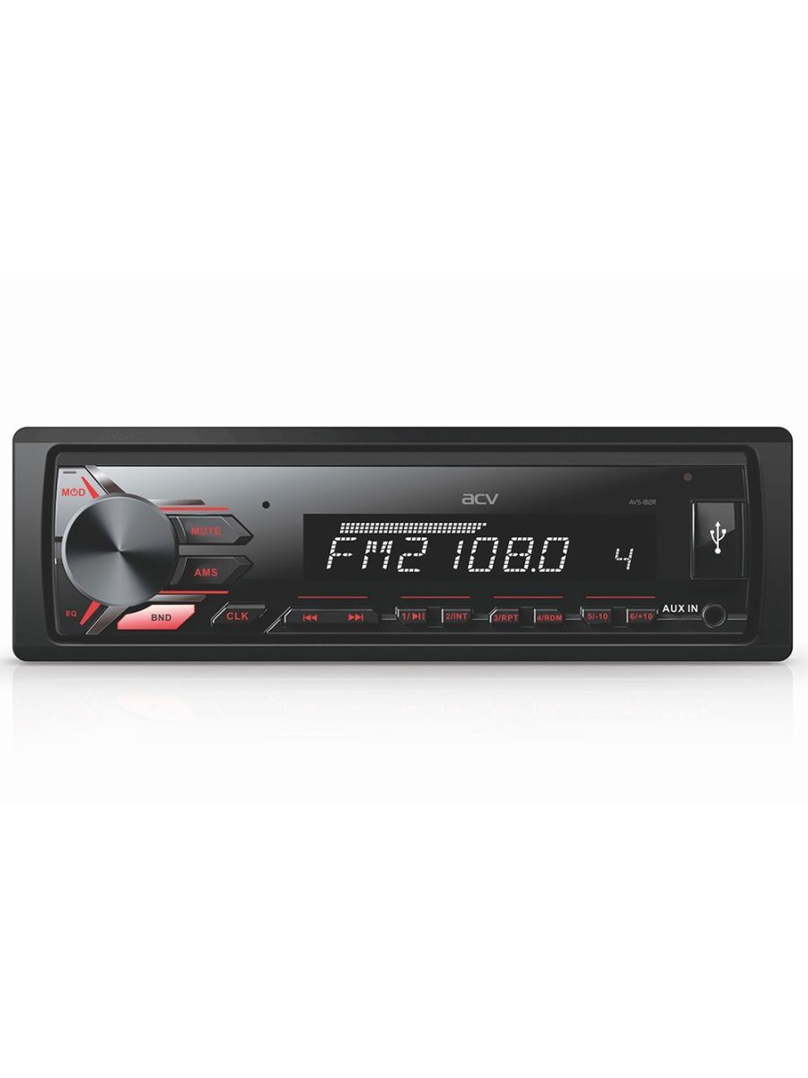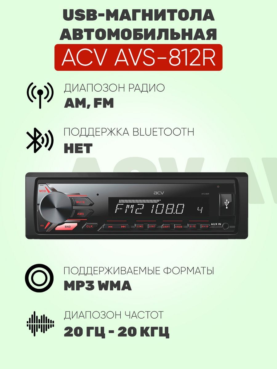 Магнитола ACV AVS-812 с красной подсветкой кнопок. Имеет удобный для установки размер 1 DIN, а также оборудована USB-портом. Все самые нужные функции собраны в одном устройстве.Автомагнитола ACV AVS-812 оснащена FM тюнером, также позволяет воспроизводить композиции с USB носителей и карт SD. Если вам нужна хорошая магнитола по привлекательной цене, то эта модель, безусловно, заслуживает внимания. Она исполнена в классическом дизайне с белой подсветкой кнопок, воспроизводит все популярные форматы файлов и очень удобна в эксплуатации.