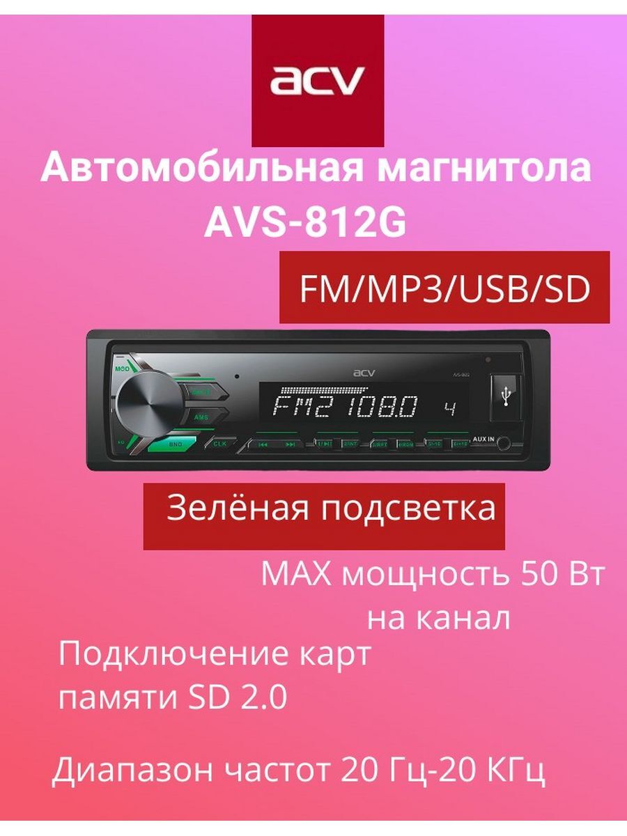 Магнитола ACV AVS-812 с зеленой подсветкой кнопок. Имеет удобный для установки размер 1 DIN, а также оборудована USB-портом. Все самые нужные функции собраны в одном устройстве.Автомагнитола ACV AVS-812 оснащена FM тюнером, также позволяет воспроизводить композиции с USB носителей и карт SD. Если вам нужна хорошая магнитола по привлекательной цене, то эта модель, безусловно, заслуживает внимания. Она исполнена в классическом дизайне с белой подсветкой кнопок, воспроизводит все популярные форматы файлов и очень удобна в эксплуатации.