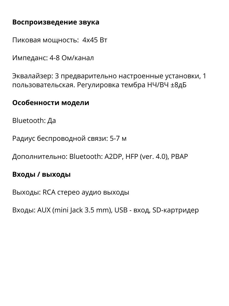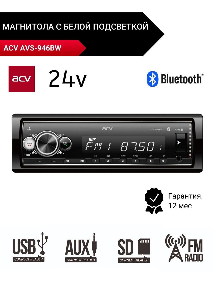 Возьмите любимую музыку в дорогу с помощью автомагнитолы ACV AVS-946BW с bluetooth для грузовых автомобилей! Магнитола c блютуз предназначена для грузовых машин с напряжением бортовой сети 24 V, этот автомобильный аксессуар сделает любые поездки более интересными. Плеер читает популярные носители USB и SD. Воспроизводит самые актуальных форматы MP3, WMA, WAV, FLAC; Автопроигрыватель имеет удобное управление и современный дизайн с зеленой подсветкой кнопок. В памяти автомагнитофона сохраняется до 18 станций радио в диапазоне FM, их настройку можно выполнить автоматически или в ручном режиме. Так же у нас представлена модель с зеленой подсветкой и другие автотовары.