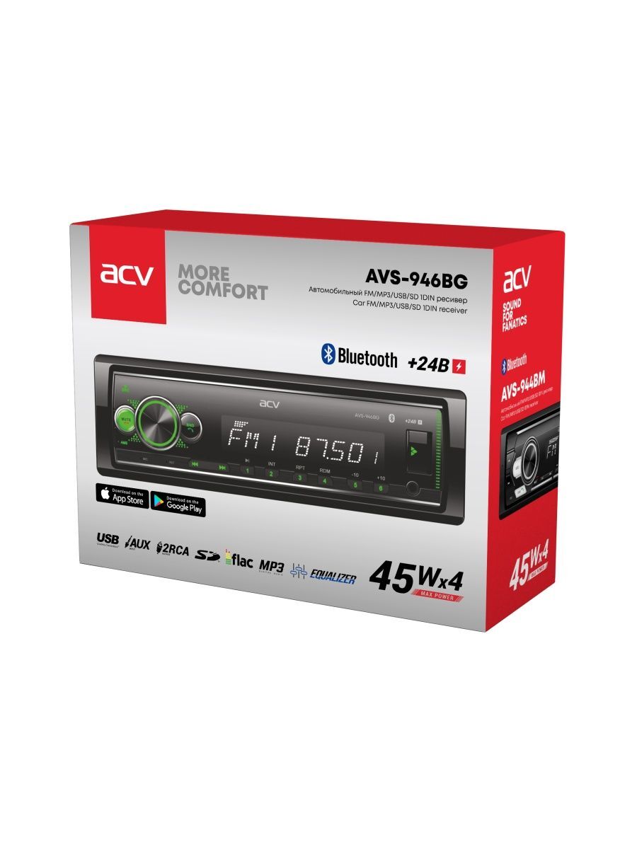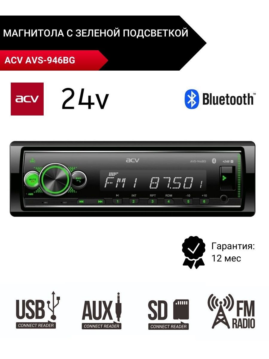 Возьмите любимую музыку в дорогу с помощью автомагнитолы ACV AVS-946BG с bluetooth для грузовых автомобилей! Магнитола c блютуз предназначена для грузовых машин с напряжением бортовой сети 24 V, этот автомобильный аксессуар сделает любые поездки более интересными. Плеер читает популярные носители USB и SD. Воспроизводит самые актуальных форматы MP3, WMA, WAV, FLAC; Автопроигрыватель имеет удобное управление и современный дизайн с зеленой подсветкой кнопок. В памяти автомагнитофона сохраняется до 18 станций радио в диапазоне FM, их настройку можно выполнить автоматически или в ручном режиме. Так же у нас представлена модель с белой подсветкой и другие автотовары.