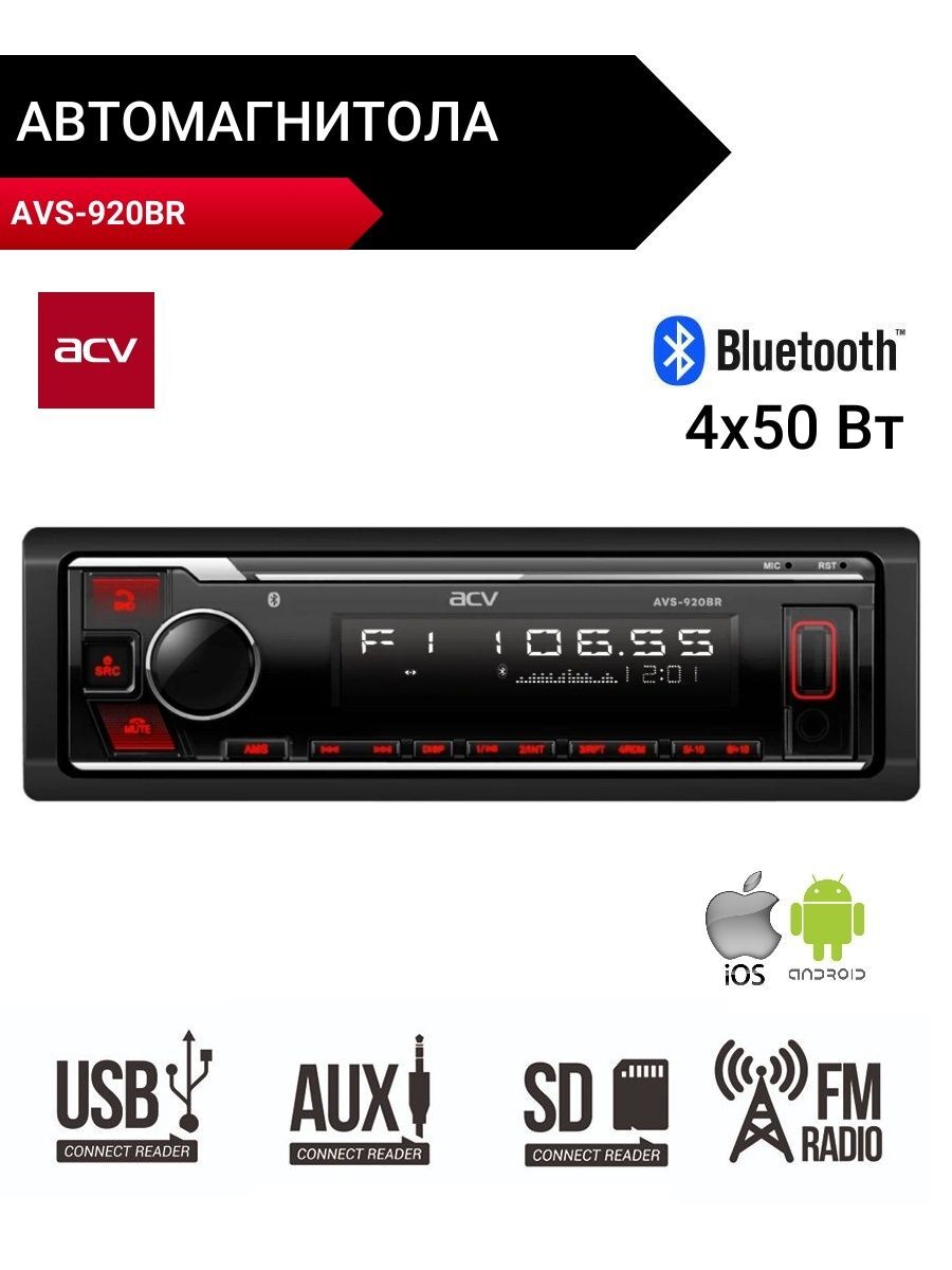 ACV AVS-920BR Магнитола с Bluetooth (Блютуз), поддержкой приложений ACV RC для Android (Андроид) и ACV Control для iOS. Оснащена встроенным усилителем с максимальной мощностью 4х50 Вт, RCA стерео аудио выходами, читает MP3/WMA с USB и SD носителей. В этой автомобильной магнитоле AVS-920BR собраны самые современные возможности и опции для чтения и воспроизведения аудио файлов в высоком качестве. Помимо четырех предустановок эквалайзера у плеера в машину есть баланс правых и левых, передних и задних акустических компонентов, изменение тембра НЧ, ВЧ и другие опции. Ресивер автомобильный сделает поездки на автомобиле более комфортными и интересными. Автомагнитола с красной подсветкой кнопок поддерживает наиболее популярные источники звука: USB и SD цифровые носители, смартфоны Android и iOS (через приложения ACV RC и ACV Control). Цифровой FM тюнер обеспечивает качественный прием станций без помех, их можно настроить автоматически или в ручном режиме. При чтении носителей на экран магнитолы выводится информация с ID3 тегов: название альбома, песни, исполнителя и т.д. Вертикально поляризованный VA LCD дисплей с широким углом обзора обеспечивает превосходную визуализацию контента и его читабельность в любых условиях.