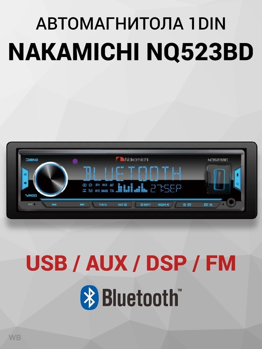 Компактный и максимально простой в управлении медиарисивер с возможностью дополнительный подключений для расширения аудиосистемы и добавлений новых функций. Bluetooth версии 5.0 с протоколами A2DP и HFР1.6 позволяет организовать потоковое воспроизведение музыкальных файлов с мобильных устройств и совершать телефонные звонки, не отвлекаясь от вождения и не нарушая правила дорожного движения. Магнитола оснащена широкоугольным ЖК-дисплеем (2 строки). Мультиподсветка экрана и кнопок 7 цветов (красный, зеленый, синий, желтый, бирюзовый, фиолетовый, белый). UX-вход jack 3,5 мм. Слот SD-карты. Поддерживаемые форматы: MP3, WMA, WAV, FLAC. Встроенный усилитель 50 Вт х 4. RCA выходы 2 фронт, 2 тыл, 1 сабвуфер (регулировка уровня, фазы), 1 центральный канал.. Официальное приложение NAKAMICHI AMC доступно в сервисах Google Play и App Store. Скачайте его, установите на телефон и получите простой и удобный инструмент для настройки любых параметров медиаресивера от выбора источника воспроизведения и цвета подсветки кнопок до настройки поканальных фильтров и временных задержек. Для большего комфорта в управлении в комплект поставки входит пульт дистанционного управления. В число других достоинств медиаресивера NQ523BD входит 40-полосный параметрический эквалайзер, воспроизведение несжатых файлов FLAC (96 кГц/24 бит), фильтры высоких и низких частот крутизной 6, 12, 18 или 24 дБ/окт. Расширение системы внешними усилителями через 6 выходов RCA (2 фронт / 2 тыл / сабвуфер / центральный канал). Опциональный интерфейс кнопок рулевого управления. DSP-процессор быстро изменяет поток цифровых сигналов, управляет задержками на каждом канале. Эта автомагнитола является аналогом AURA 77DSP, AURA 88DSP, AURA 78DSP. Магнитола автомобильная Nakamichi NQ523BD 1 din, ресивер в машину USB, AUX, Bluetooth, DSP процессор, 3 пары выхода RCA (фронт+тыл+сабвуфер). Универсальная, подойдёт на 99% машин с форматом 1DIN. Качественная и недорогая автомагнитола. Обладает русским языком, RGB подсветкой + пульт дистанционного управления. **Эквалайзер** параметрический 40 полосный. Выходная мощность (максимальная): 4х50 Ватт, **Bluetooth** v5.0, **Радио** FM/AM, **Тип дисплея** ЖК 2 Строки, **Беспроводной пульт ДУ** В комплекте. Комплектуется ISO коннектором. Рабочее напряжение 14,4 В (допустимо 10,8 В). Максимальный ток 10А. Размер установки (ШхВхГ) 182ммх53 мм х 115мм. Нетто - 0,5 кг. Предохранитель - Малый предохранитель 10А (красный). АУДИО Максимальная выходная мощность 50 Вт х4. Сопротивление динамика 4-8 Ом. Предварительный выходной уровень 2В. РАДИО Диапазон частот FM87,5 МГц-108,0 МГц. Диапазон частот AM522 кГц-1710 кГц. Предустановка -18 FM. Магнитола /ресивер /магнитола в автомобиль/мафон /1DIN /в машину /в автомобиль. Автомагнитола – это встроенное в панель авто устройство, которое позволяет слушать музыку в любое время дня и ночи. Можно выбрать радио или треки, записанные на флеш-накопитель, смартфон, планшет или любой другой мобильный девайс. С гаджетом, у которого есть выход в интернет, доступно и онлайн-проигрывание.