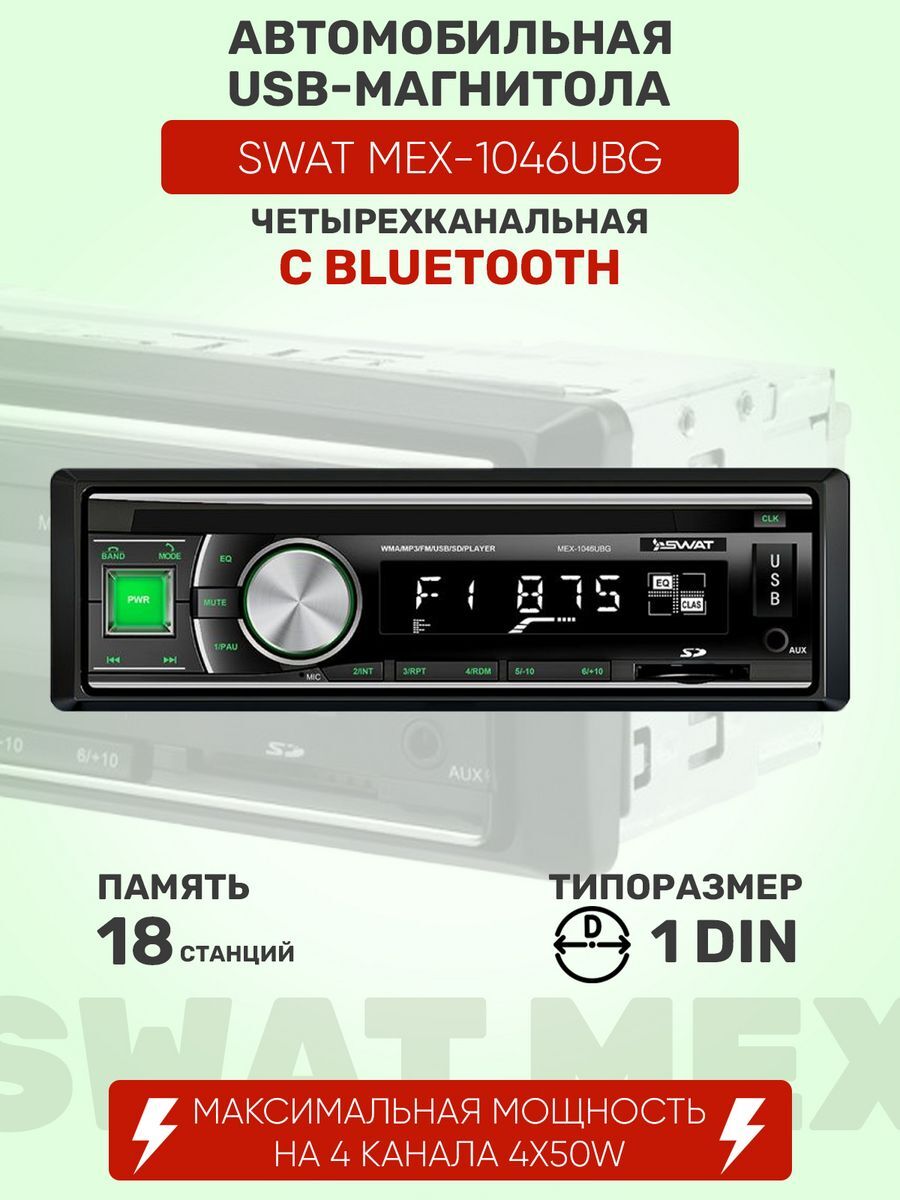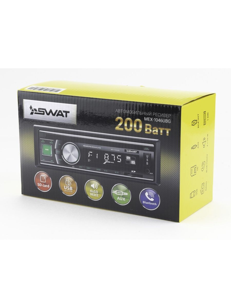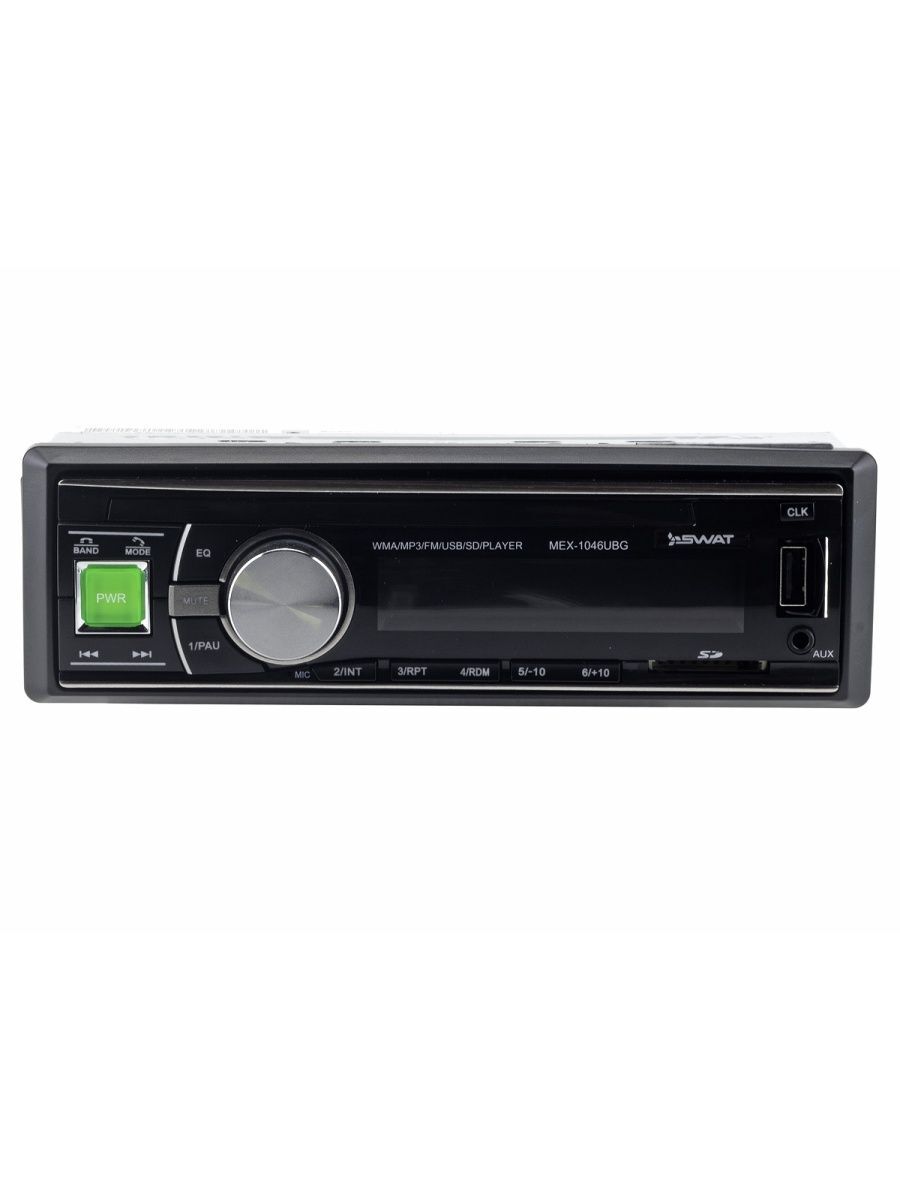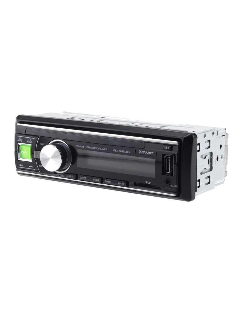 Магнитола Swat MEX-1046UBG - это недорогая автомобильная магнитола с модулем Bluetooth, памятью на 18 радиостанций и AUX- и RCA-разъёмами. Устройство типоразмера 1din, являющееся доступным расширением мультимедийного функционала вашего автомобиля, станет отличным выбором для акустических систем начального уровня. Модель с несъемной лицевой панелью имеет короткобазное шасси и отличается небольшой глубиной монтажа.Автомобильная магнитола Swat MEX-1046UBG станет надежным спутником в дороге. Мощность-4x50Вт