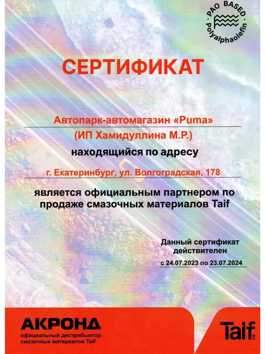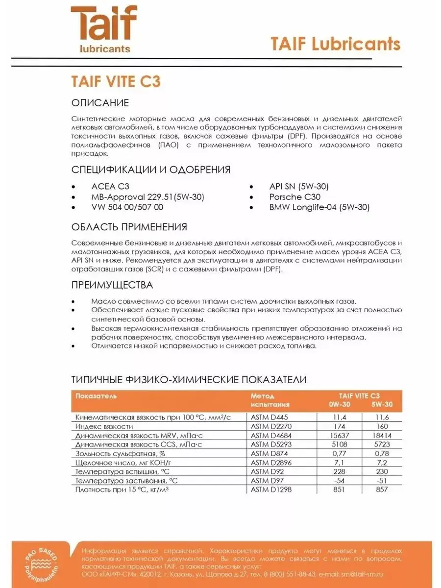 Синтетические моторные масла для современных бензиновых и дизельных двигателей легковых автомобилей, в том числе оборудованных турбонаддувом и системами снижения токсичности выхлопных газов, включая сажевые фильтры (DPF). Производятся на основе полиальфаолефинов (ПАО) с применением технологичного малозольного пакета присадок.Масло совместимо со всеми типами систем доочистки выхлопных газов. Преимущества: • Обеспечивает легкие пусковые свойства при низких температурах за счет полностью синтетической базовой основы. • Высокая термоокислительная стабильность препятствует образованию отложений на рабочих поверхностях, способствуя увеличению межсервисного интервала. • Отличается низкой испаряемостью и снижает расход топлива. Моторное масло Taif по своим свойствам и характеристикам аналогично маслам Mobil, Elf, Castrol, Total, Shell (Мобил, Эльф, Тотал, Кастрол, Шелл). Наша компания является официальным дистрибьютером масла Taif. Рекомендовано к всесезонному применению в бензиновых и дизельных двигателях.