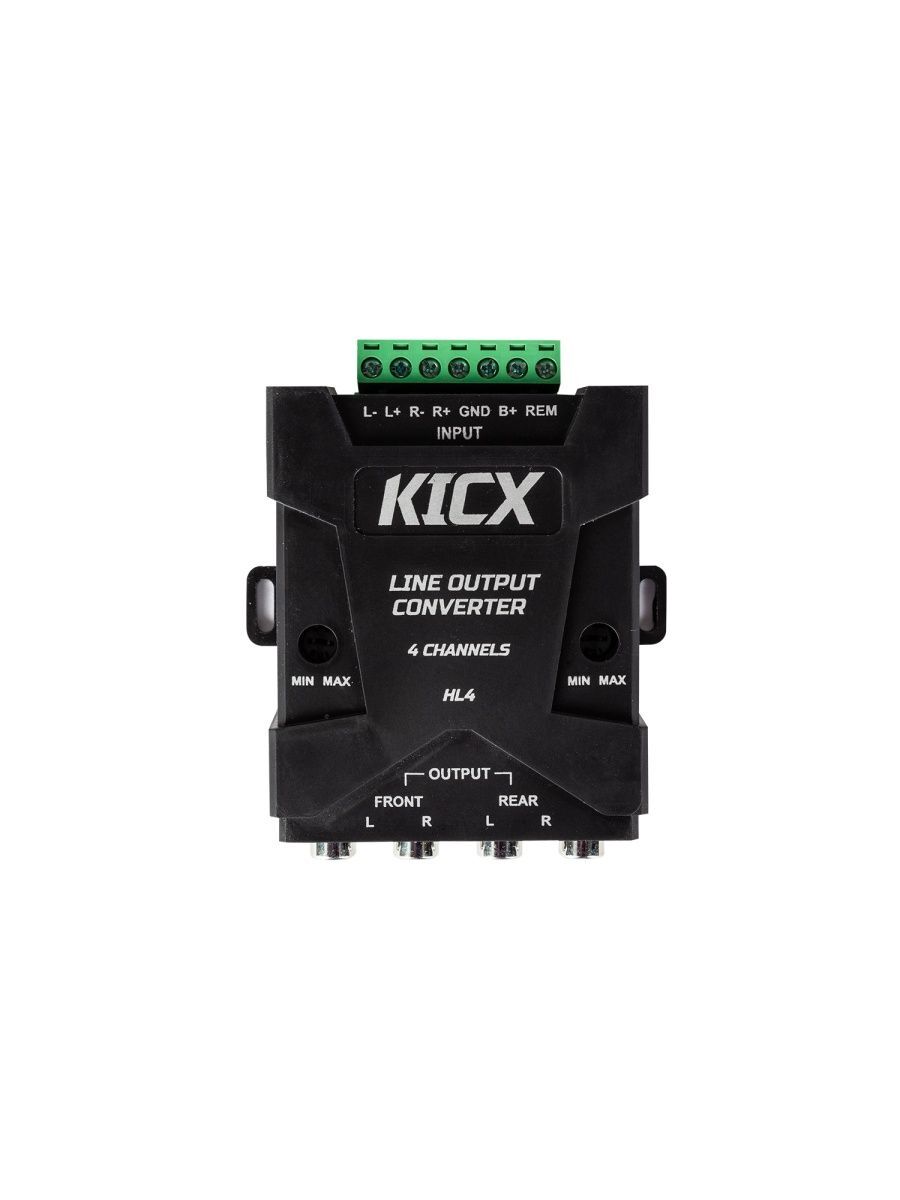 Преобразователь (конвертер) уровня сигнала Kicx HL4-преобразователь (конвертер) предназначен для соединения головных устройств, не имеющих линейных выходов, через акустические выходы к стандартным RCA-входам усилителей.4-х канальный конвертор Kicx HL4 (преобразователь) сигнала высокого уровня в сигнал низкого уровня RCA. Выход для дистанционного включения усилителя.Количество выходных каналов-4,Количество входных каналов-2,Выход "Remote"-есть,Подавление шума-есть,Напряжение питания-