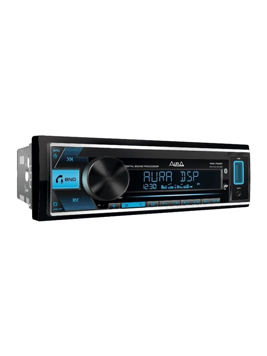 Магнитола автомобильная АУРА-76. Новая модель из популярной линейки Aura 77DSP, Aura 78DSP, Aura 79DSP Изменился дизайн. Характеристики: Максимальная выходная мощность: 51Вт, Качественный DSP-процессор, Временная коррекция звукового поля, 24-полосный параметрический эквалайзер. Два режима работы кроссовера: 2-WAY (фронт, тыл, сабвуфер), 3-WAY (поканальное подключение акустических систем плюс сабвуфер). Совместимое с Apple и Android приложение для управления всеми функциями ресивера. Чтение звуковых форматов FLAC, MP3, WAV, APE, AAC. Встроенный Bluetooth-модуль (A2DP). RGB-подсветка передней панели (3 зоны). USB-разъём с током зарядки 1.2а, RCA: 3 пары (фронт+тыл+сабвуфер), D-SWC (обучение резистивных кнопок на руле без внешнего адаптера), Комплектуется ISO коннектором.