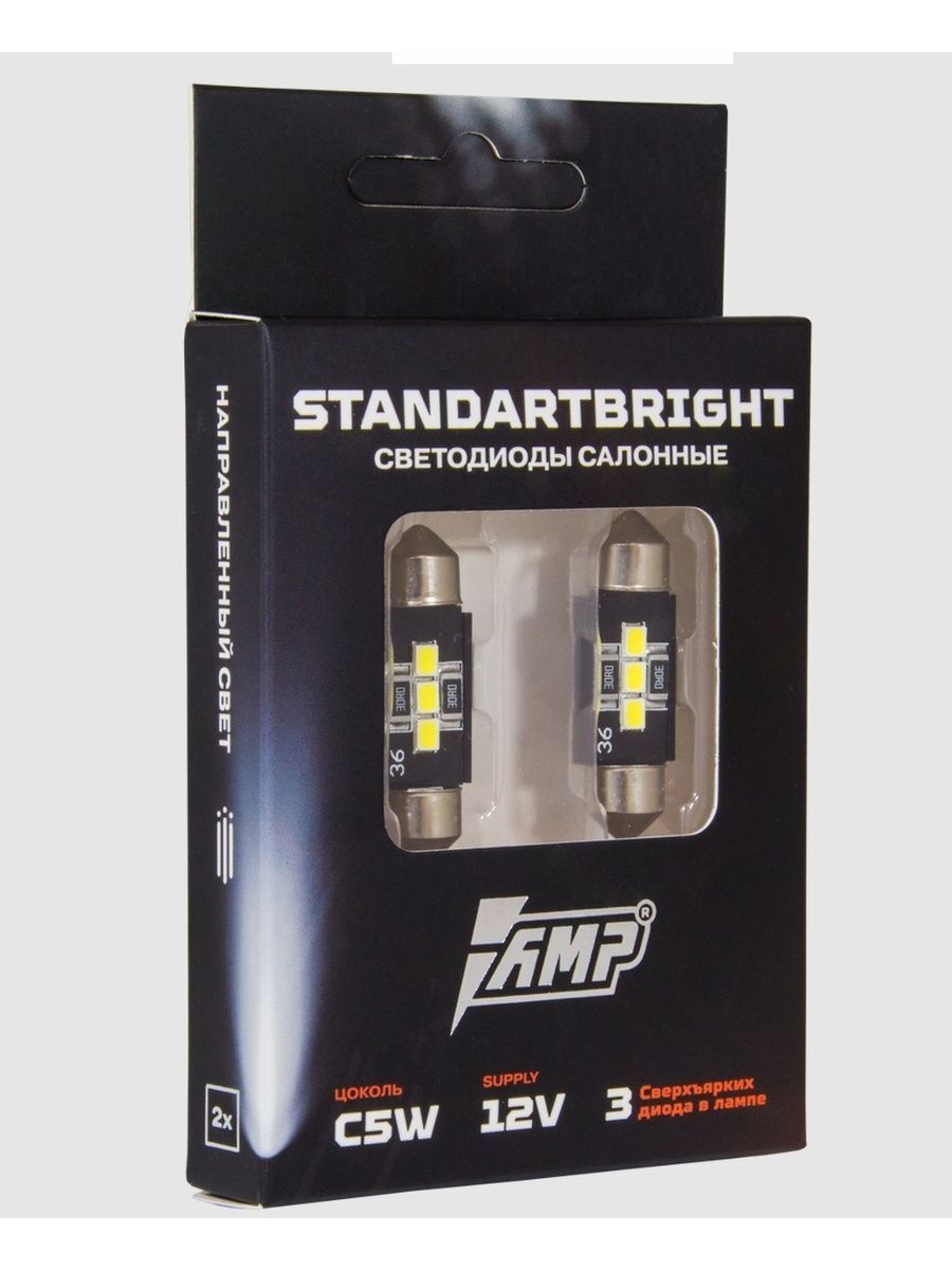 Светодиод салонный AMP StandartBright C5W(36mm) Цена указана за комплект- 2 шт. 36 мм. Модель c5w led с направленным светом и 3-мя современными сверх-яркими диодами. Салонные диоды светят намного ярче простых ламп и потребляют меньше энергии. Благодаря этому ваш аккумулятор не разрядится за ночь работы салонного освещения, как это было бы с обычными лампами. Световой поток 180 Люмен. Цветовая температура 6000 Кельвин. Алюминиевый радиатор. Светодиодные лампочки-это полупроводники, которые, пропуская электрический ток, создают световое излучение. При мощности тока в 1 Вт они способны излучать световой поток 70-100 люмен, а в группе 20-40 штук это значение еще выше. Таким образом, автомобильные LED лампы способны давать свет до 2000 лм и работать от 30 000 до 50 000 часов с небольшим снижением яркости. Отсутствие нити накаливания делает лэд-лампы устойчивыми к механическим повреждениям.