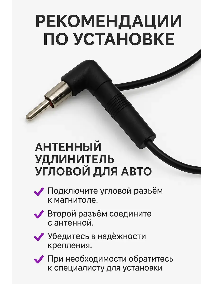 Идеально подходит для подключения автомобильной антенны к магнитоле в случаях, когда штатный кабель слишком короткий. Особенно удобен при установке нештатных радиоантенн, благодаря угловому входу, который обеспечивает комфортное подключение даже в условиях ограниченного доступа.