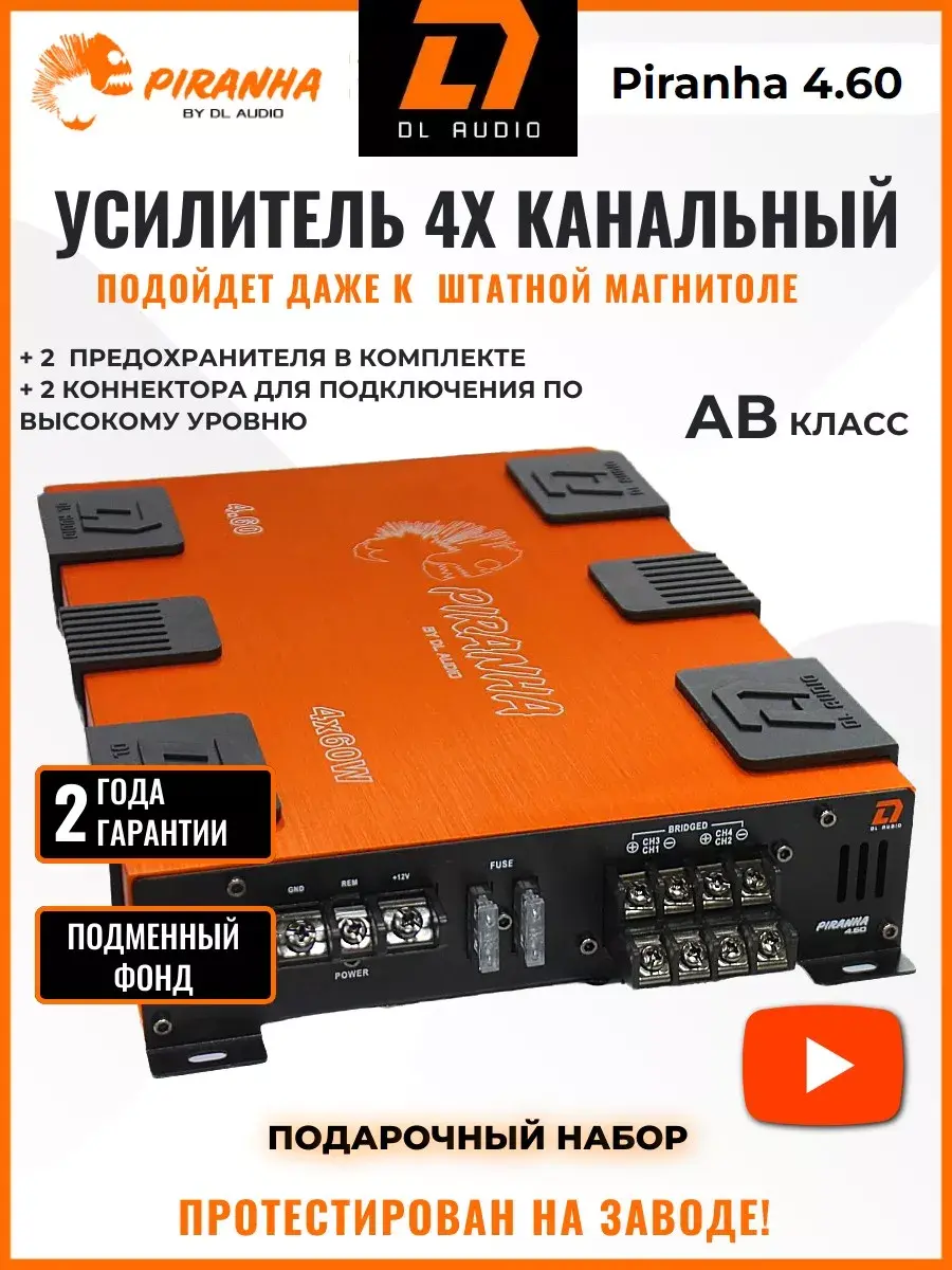 Доступный 4 канальный усилитель Piranha 4.60 в машину. Многократно меняет звучание и громкость динамиков, моноблока в лучшую сторону. Позволяет настраивать звук по отдельности фронт от тыла, имеет регулятор Gane и баса, а также очень удобную регулировку высоких и низких частот, можно сразу подрезать как сверху, так и снизу, либо рычажком оставить только высокие или оставить как есть, чтобы динамик играл всю полосу. Усилок с алюминиевым корпусом с усиленным охлаждением. Оригинальный товар с гарантией от производителя. Вся продукция протестирована на заводе. Будет отличным подарком для мужчины, женщины и любого любителя автозвука.