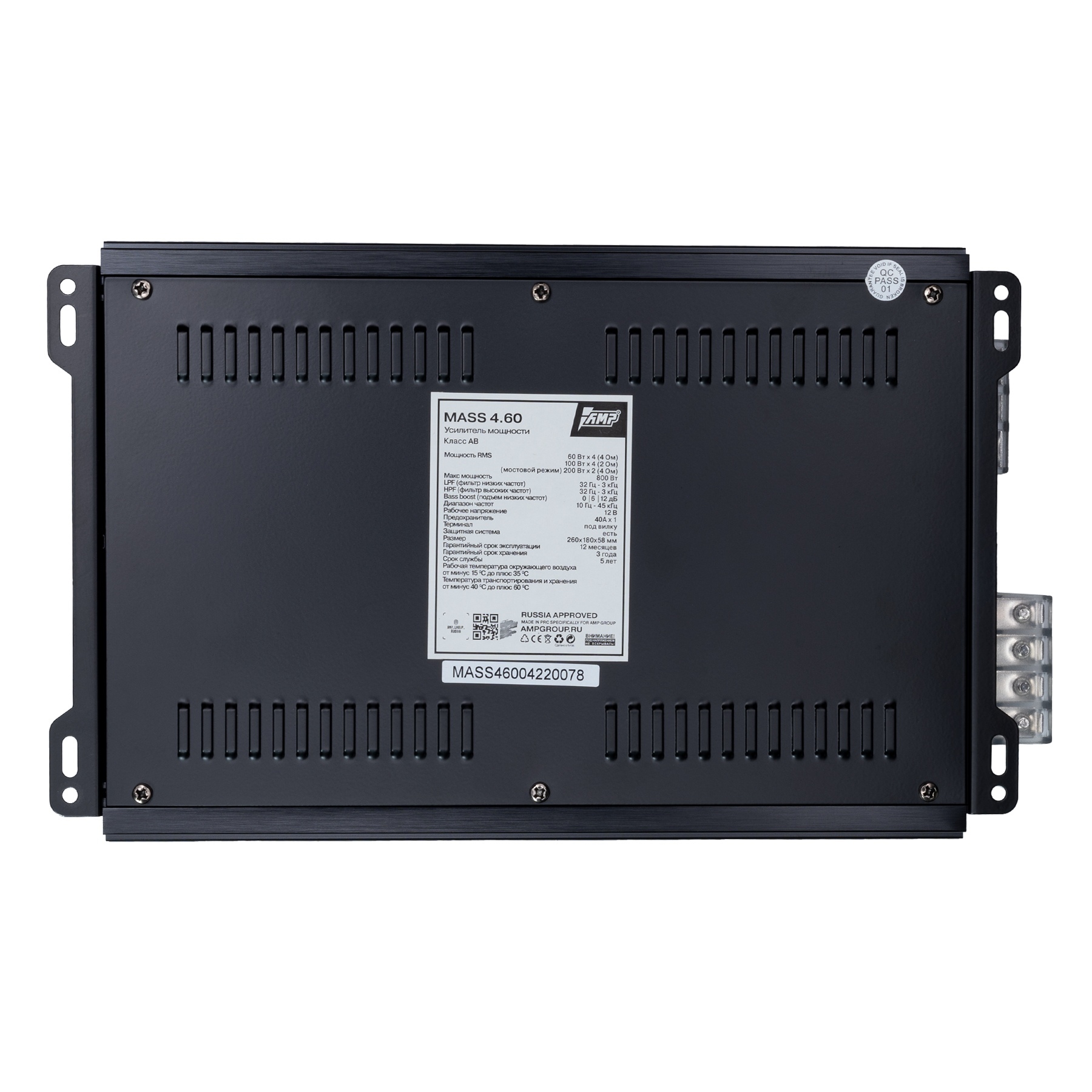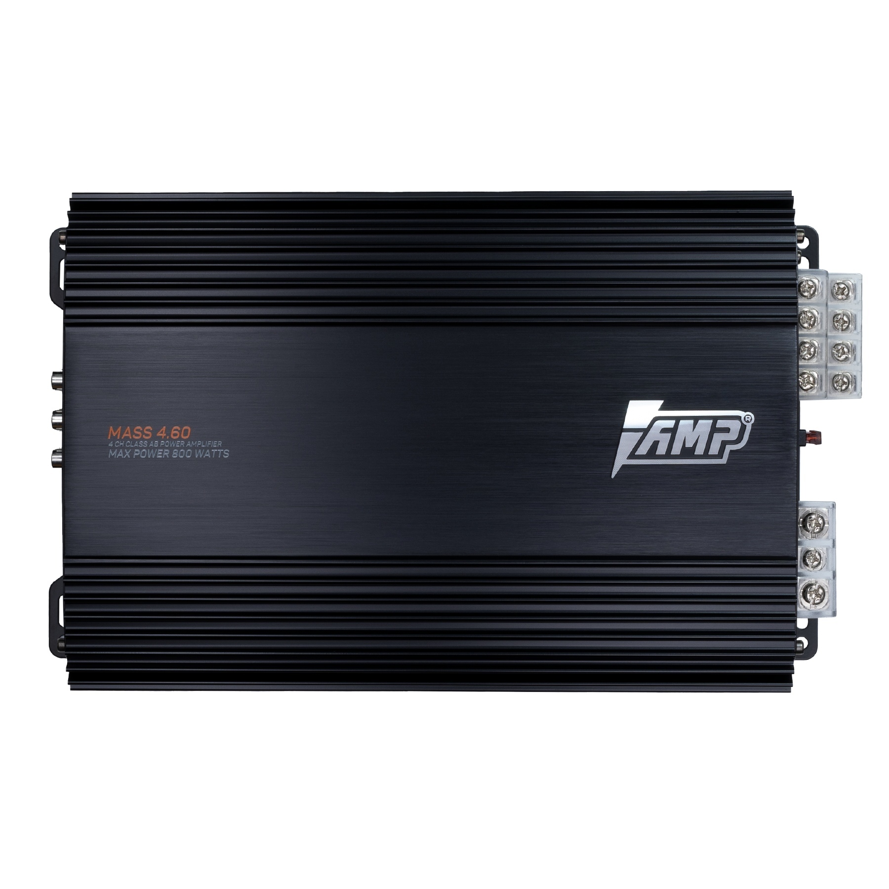 Самый популярный из всех представленных новинок. Четыре канала по 60 ватт раскачают любую компонентную акустику начального уровня, а возможность отдать 200 ватт в мостовом режиме позволит подключить к нему простенький сабвуфер. Кроссовер устроен так, чтобы он мог работать с любыми магнитолами и самое главное решать вопросы по канального подключения компонентов. Имеет класс АВ. Выдает 100 Вт х 4 при нагрузке в 2 Ома. Мостовой режим 200 Вт x 2 (4 Ом). Фильтр высоких и низких частот от 32 Гц до 3 кГц. Диапазон частот 10 Гц- 45 кГц. Пиковая мощность 800 Вт. Имеется защитная система. Срок службы до 5-ти лет. Гарантийный срок хранения 3 года. Способен работать при температурах окружающего воздуха от минус 15 до плюс 45 градусов. Усилитель звука — это аудиокомпонент, главная задача которого — усилить слабый сигнал, поступающий от источника звука, например, от автомагнитолы. Внутри усилителя аудиосигнал многократно усиливается и преобразовывается, а после подаётся в акустическую систему, и м