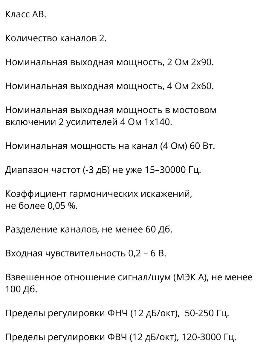 Номинальная выходная мощность в мостовом включении 2 усилителей 4 Ом 1х140. Номинальная мощность на канал (4 Ом) 60 Вт.Диапазон частот (-3 дБ) не уже 15–30000 Гц. Коэффициент гармонических искажений не более 0,05 %. Разделение каналов не менее 60 Дб.