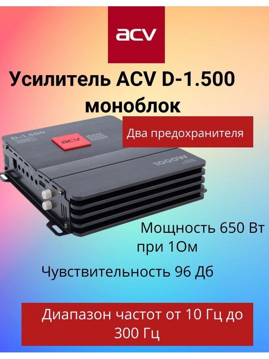 Усилитель ACV D-1.500 моноблок -мощный моноблок для впечатляющих басов, который демонстрирует высокую производительность. Для этого у него имеются все необходимые характеристики – возможность работы при 1, 2 и 4 Ом, надежная система охлаждения и два предохранителя по 35 А. ХАРАКТЕРИСТИКИ 650 Вт при 1Ом - это мощность, которая позволит разыграть мощный средне бюджетный сабвуфер и подарить отличные ощущения от басов как пассажирам, так и людям, находящимся вблизи. С ним Ваш сабвуфер покажет всю свою эффективность и заставит вибрировать все в округе. Усилитель звука в машину ACV имеет диапазон частот от 10 Гц до 300 Гц. Он предназначен для усиления мощности низкочастотной акустики, что делает звук действительно качественным. Для среза лишних частот имеется Low-pass фильтр 30-250 Гц, система имеет превосходную входную чувствительность и отношение сигнал/шум 96 дБ. Даже при самых высоких нагрузках усилитель звука автомобильный не выдает искажений. ПОДКЛЮЧЕНИЕ Основная сфера применения моноблоков – это подключение сабвуферов, они делают нижние частоты сочными и выразительными и привносят в акустику автомобиля то самое глубокое дыхание баса, к которому и стремятся истинные меломаны. ОСНОВНЫЕ ХАРАКТЕРИСТИКИ Количество каналов 1 Класс: D Цвет: Чёрный Коэффициент гармонических искажений (THD): 0,15% Диапазон воспроизводимых частот: 10 - 300 Гц Отношение сигнал/шум: > 96 Дб Мощность Номинальная мощность RMS в 1 Ом, количество каналов х Вт: 1 х 650 Номинальная мощность RMS в 2 Ом, количество каналов х Вт: 1 х 600 Номинальная мощность RMS в 4 Ом, количество каналов х Вт: 1 х 300 Сабвуферный канал Подъем НЧ (Bass Boost): 0 - 18