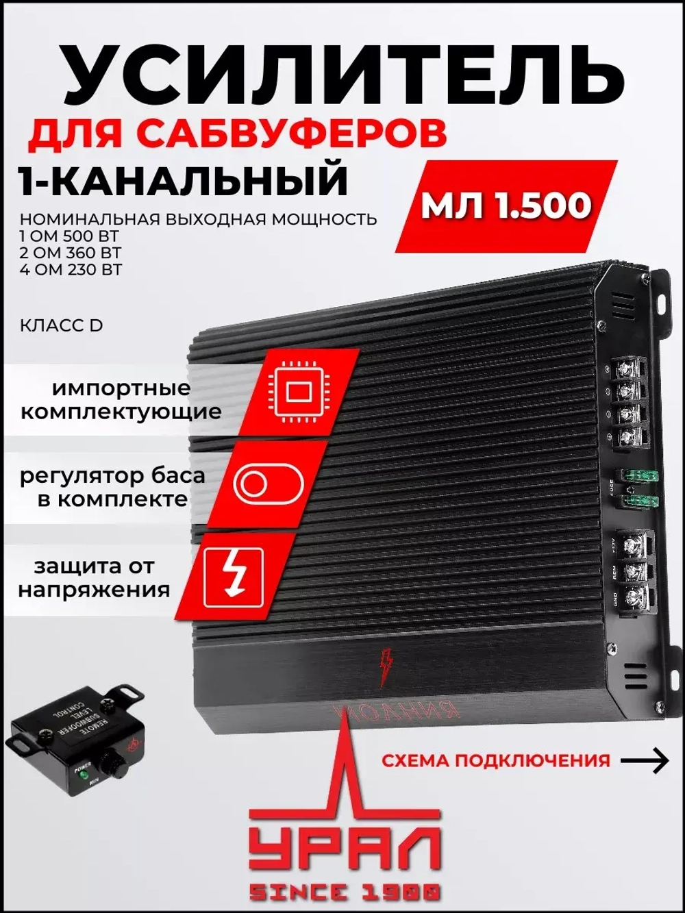 Автомобильный, одноканальный усилитель класса D Ural Урал Молния 1 500 для сабвуферов в машину. Одновременно можно подключить 2саба в автомобиле. Моноблок разработан для любителей автозвука, которые хотят получить качественный и надежный продукт по разумной цене. Основные задачи, которые решались при разработке: надежность и качество звучания. Особое внимание было уделено уровню комплектующих и проработке конструкции. Разработанный дизайн профиля корпуса для максимального охлаждения. Компьютерное моделирование разводки платы для оптимального согласования компонентов. Удобные винтовые терминалы. Выносной регулятор баса в комплекте. Отличный набор для автоакустики.