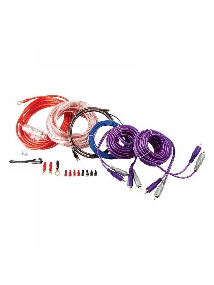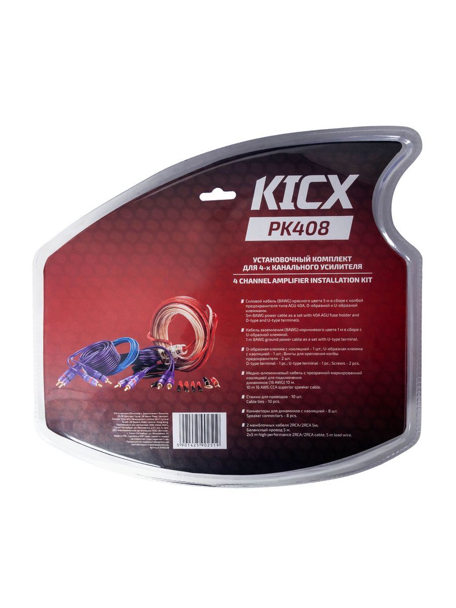 Установочный комплект для 4-х канального усилителя Kicx PK 408. Состав комплекта: 5м 8AWG силовой медно-алюминиевый кабель красного цвета в сборе с держателем для предохранителя типа AGU и силовой O-образной клеммой, 1м 8AWG силовой медно-алюминиевый кабель заземления коричневого цвета в сборе с U-образной клеммой,2x5м межблочных кабеля 2RCA/ 2RCA с прямыми коннекторами, 10м 16AWG медно-алюминиевого кабеля с прозрачной изоляцией для подключения динамиков, 5м 18 AWG провод управления голубого цвета, 8AWG O-образная cиловая клемма с изоляцией 1 шт., 8AWG U-образная клемма с изоляцией 2 шт., коннекторы для динамиков с изоляцией 8 шт., 1x40A предохранитель типа AGU, винты для крепления колбы предохранителя 2 шт., 10 пластиковых хомутов-стяжек.