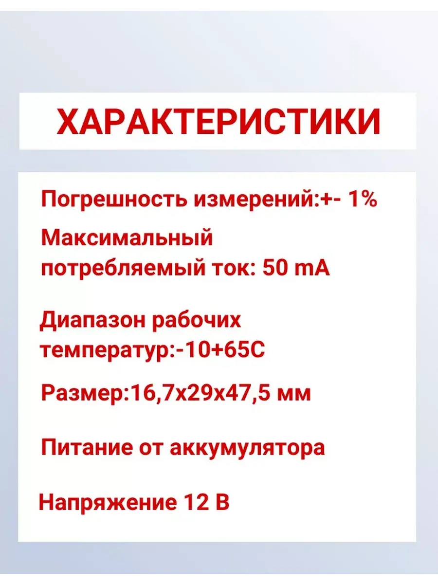 Напряжение питания 0-30 В, диапазон измерения 9-12 В, максимальный ток 50 мА, частота обновления 200 мС